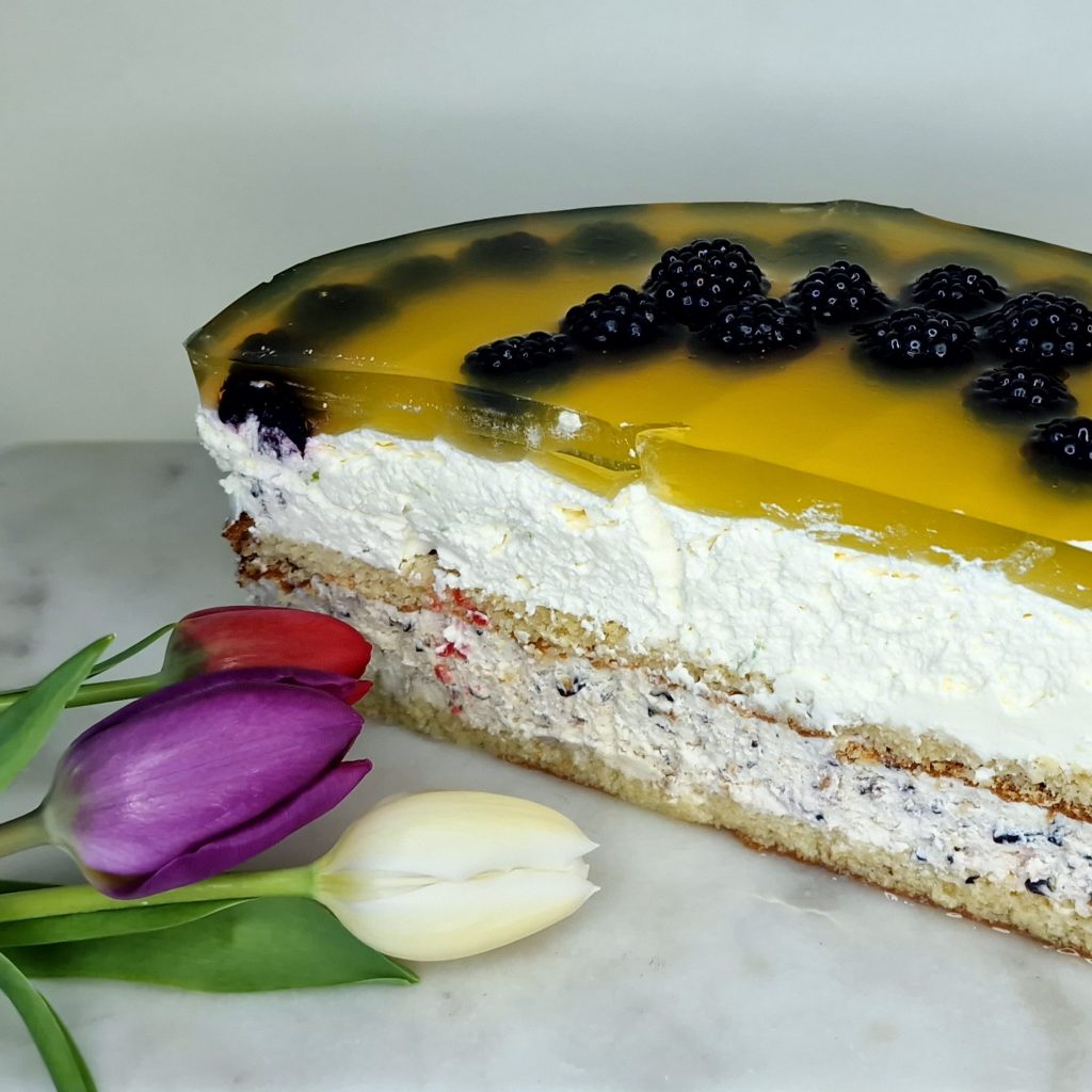 Made with 3 types of berries: Blackberries, Raspberries & Cranberries. Hints of lemon zest blended into a smooth, creamy filling. <3.1g carbs & 257 kcal per 100g